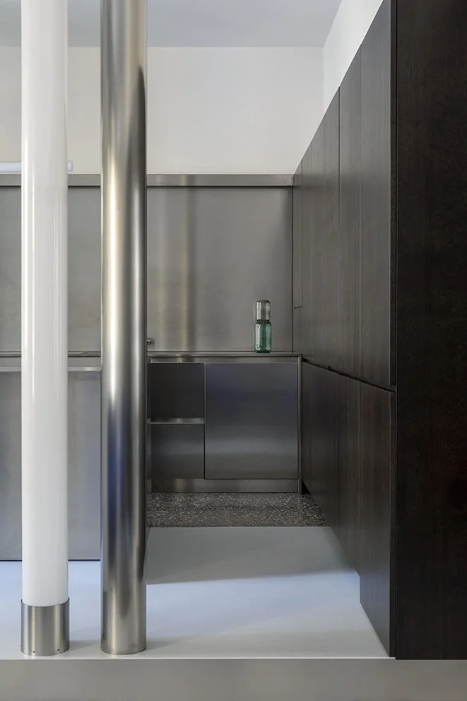 The Scotch Brite stainless steel kitchen is the scenic backdrop to the living area: the cold industrial finish enhances its synthetic forms, in dissonance with the warm walls and dark wood, or in assonance with the resin cement on the floor.