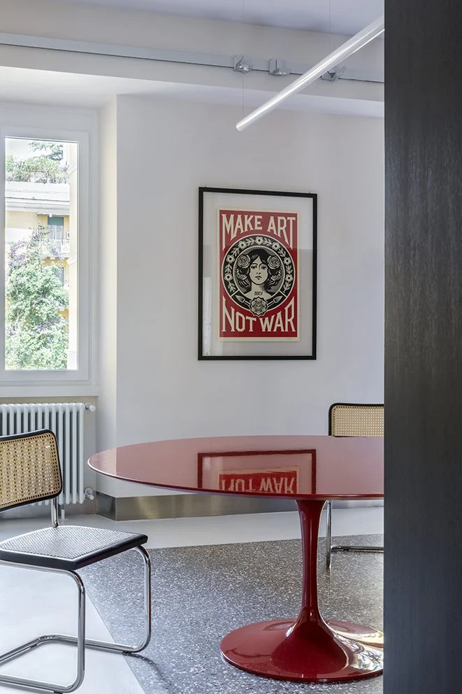 In the bathrooms, the glass mosaics - the ruby red coverings in the bathroom with bathtub and ice white in the one with shower - are in dialogue with the marble tops that surround the sinks, following an approach of composed eclecticism.