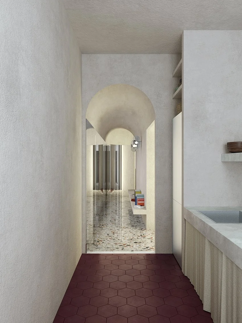 The flat, on the top floor of a historic building, is a succession of rooms flooded with light—a sequence of scenes whose common thread is the continuous interplay of delicate contrasts in colours and finishes. Glossy, iridescent surfaces alternate with rough walls, while floors from another era dialogue with new contemporary inserts.
