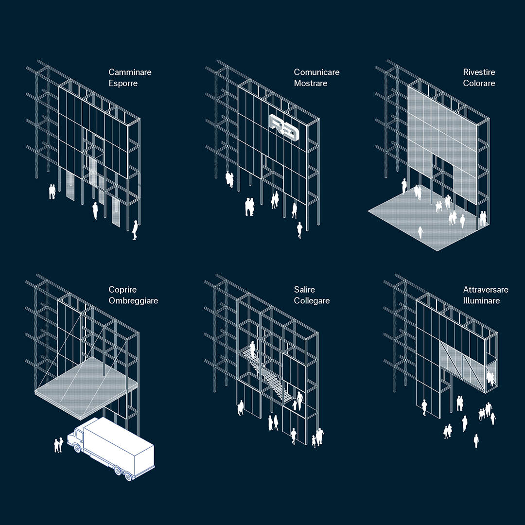 La proposta è quindi imperniata su un sistema evolutivo, nella forma e nell’approccio, nello spazio e nel tempo. Un traliccio metallico attraversa gli spazi della sede organizzando le funzioni, ospitando messaggi di brand e divenendo esso stesso luogo da attraversare e simbolo da veicolare. La possibilità di plasmare la sua dimensione, posizione e forma in base alle esigenze estende il suo valore, trasformandolo da soluzione bloccata e chiusa a metodo flessibile e adattabile.
